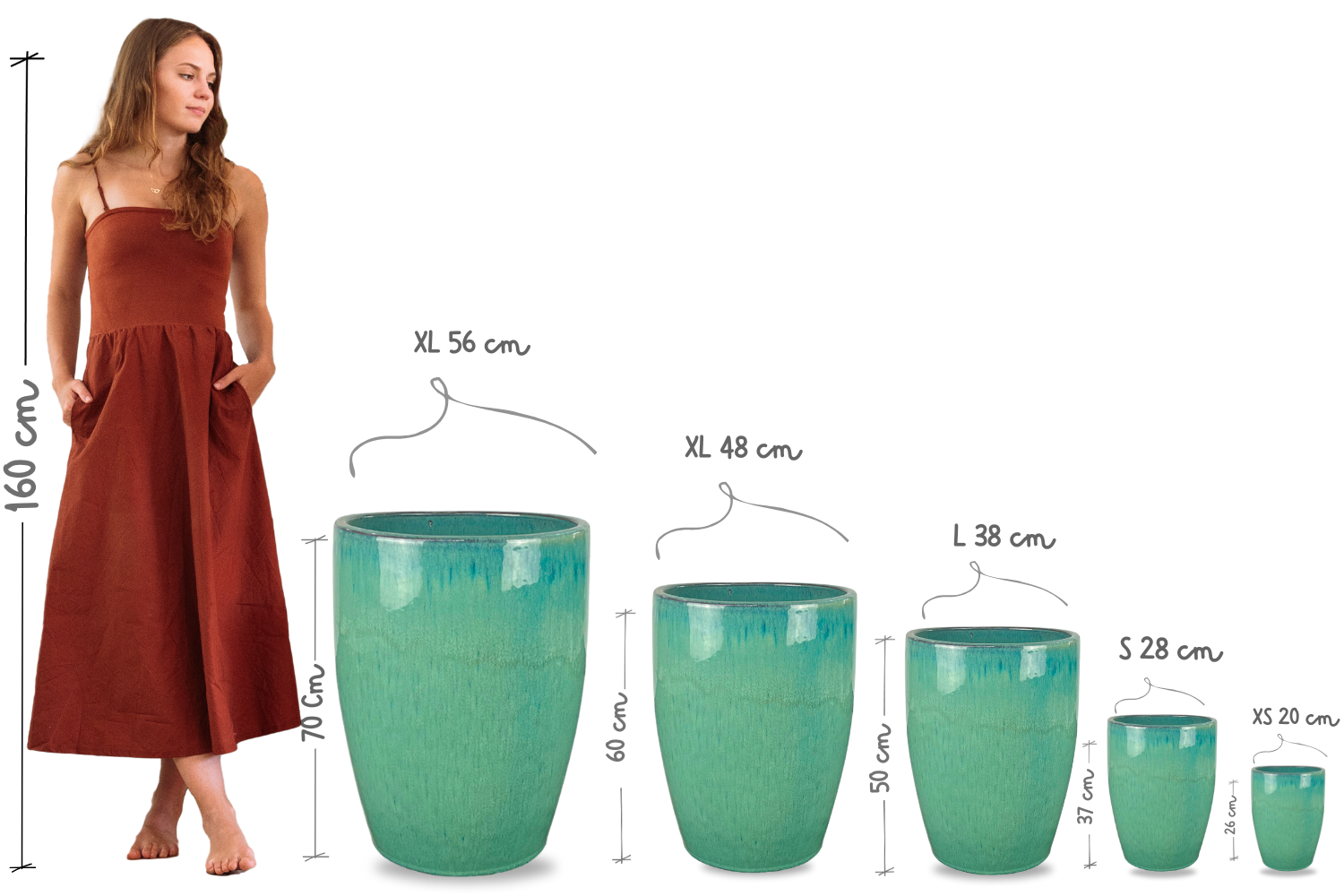 Sie haben die Wahl zwischen mehreren Größen, von der kleinsten (XS) bis zur größten (XXL), die eine Höhe von bis zu 70 cm erreicht. Dank seines klaren Designs passt der Blumentopf Platon sowohl perfekt in moderne als auch traditionelle Räume und unterstreicht die Schlichtheit und Eleganz der Umgebung.
