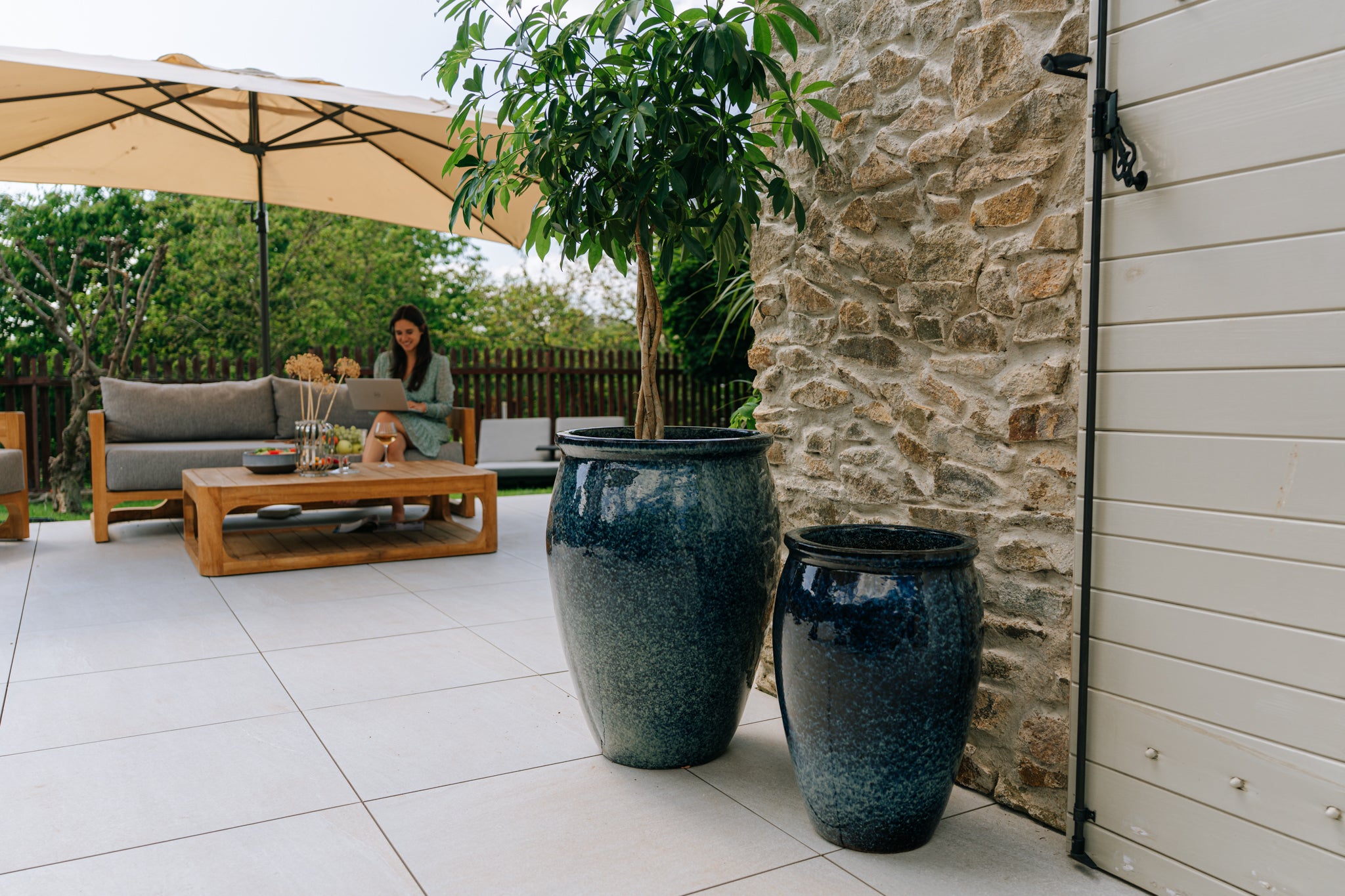 Bereichern Sie Ihren Garten mit zeitlosem Stil durch den handgefertigten Blumentopf Provencelia Bacchus. Dieser Blumentopf, inspiriert vom traditionellen Anduze-Stil, wird sorgfältig aus glasiertem Terrakotta gefertigt, das frost- und wetterbeständig ist. Zur Auswahl stehen zwei Größen – von XL bis XXL, mit einer Höhe von bis zu 68 cm und einem Durchmesser von 50 cm. Er besticht durch seine tiefe stahlblaue Farbe und das klare Design, das die Reinheit und Einfachheit unterstreicht.