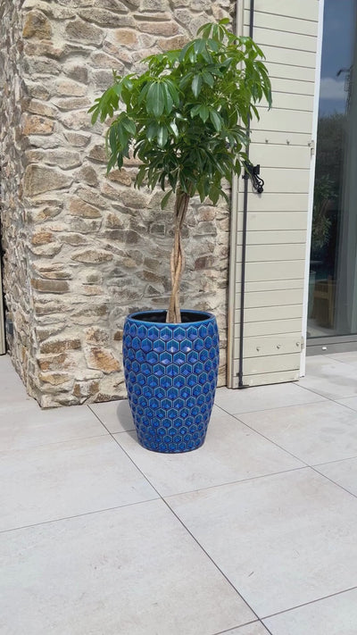Dieser elegante Blumentopf aus Keramik in kräftigem Blau mit markantem plastischem Muster verleiht Ihrem Innen- und Außenbereich Energie, Stil und einen Hauch von Luxus. Mit einer Höhe von 53 cm und einem Fassungsvermögen von 35 Litern ist er ideal für mittelgroße bis größere Pflanzen, die darin besonders gut zur Geltung kommen.